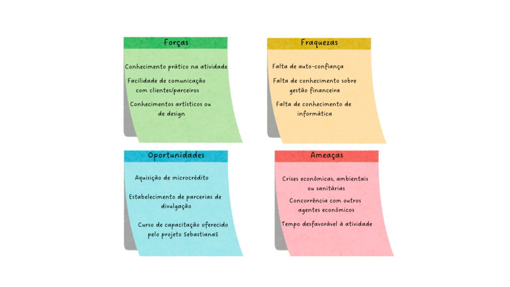 No que diz respeito ao ambiente externo, o primeiro passo é o reconhecimento de Oportunidades (Opportunities) que podem favorecer ou facilitar o alcance dos seus objetivos. Várias possibilidades podem ser consideradas, desde a de adquirir microcrédito para investir em seu pequeno negócio, a de estabelecer parcerias com outros empreendedores da sua localidade para apoio e divulgação mútua, o surgimento de novas demandas na sociedade, até às oportunidades de capacitação, como a oferecida pelo projeto SebastianaS. Em outras palavras, fatores externos que podem aumentar sua capacidade de investir, de incrementar o número de clientes, de evoluir nas capacidades de gestão, etc.